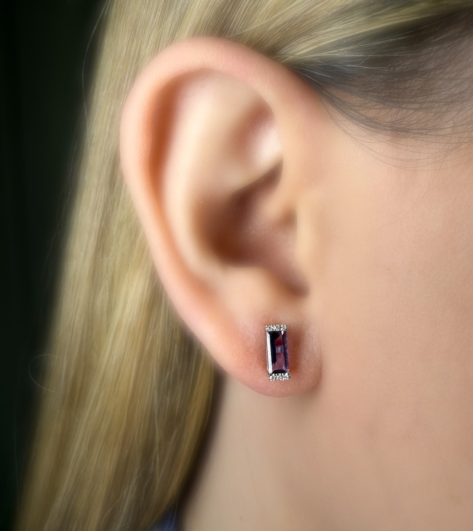 These sleek earrings showcase richly hued rectangular-cut amethysts accented by rows of white diamonds on either end. Set in 14K white gold, the clean vertical design blends vibrant color with modern refinement.