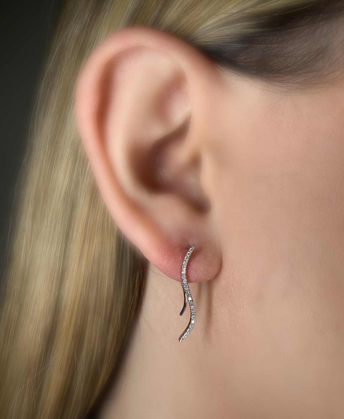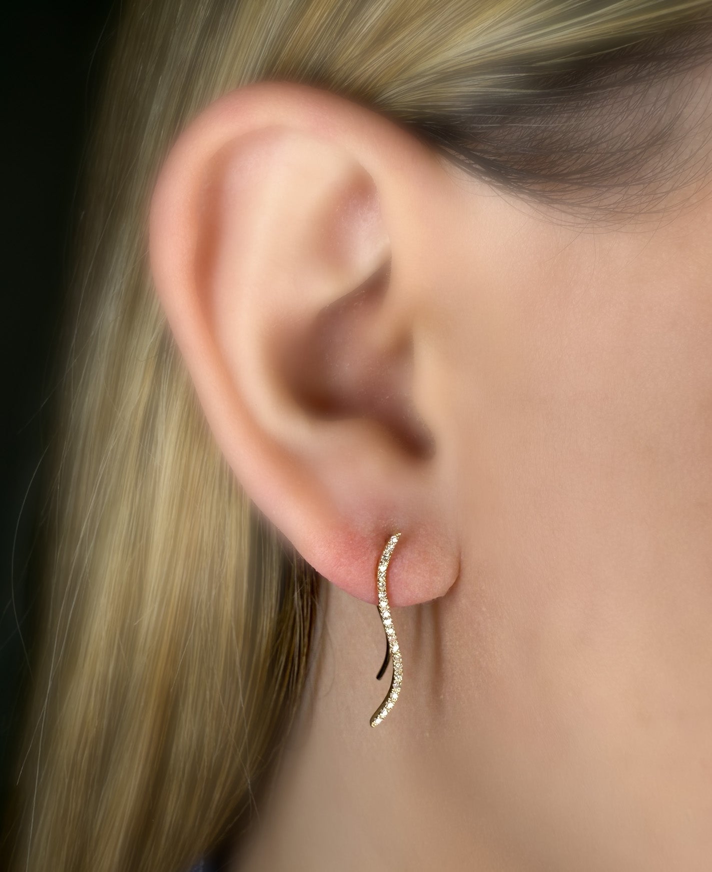 These sculptural earrings feature a graceful wave silhouette lined with pavé-set white diamonds. Available in your choice of 14K white or yellow gold, their fluid form threads delicately through the ear for a sleek, modern finish.