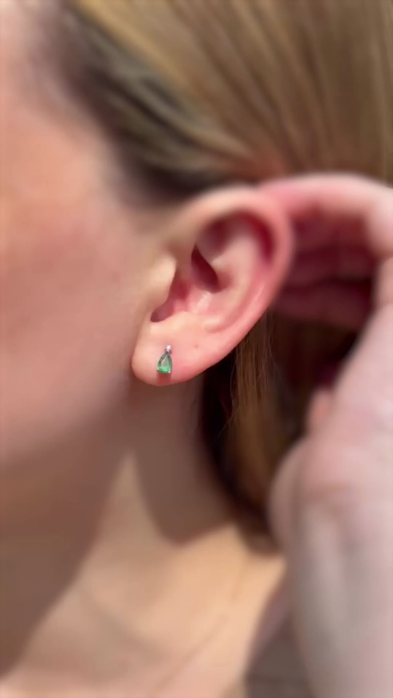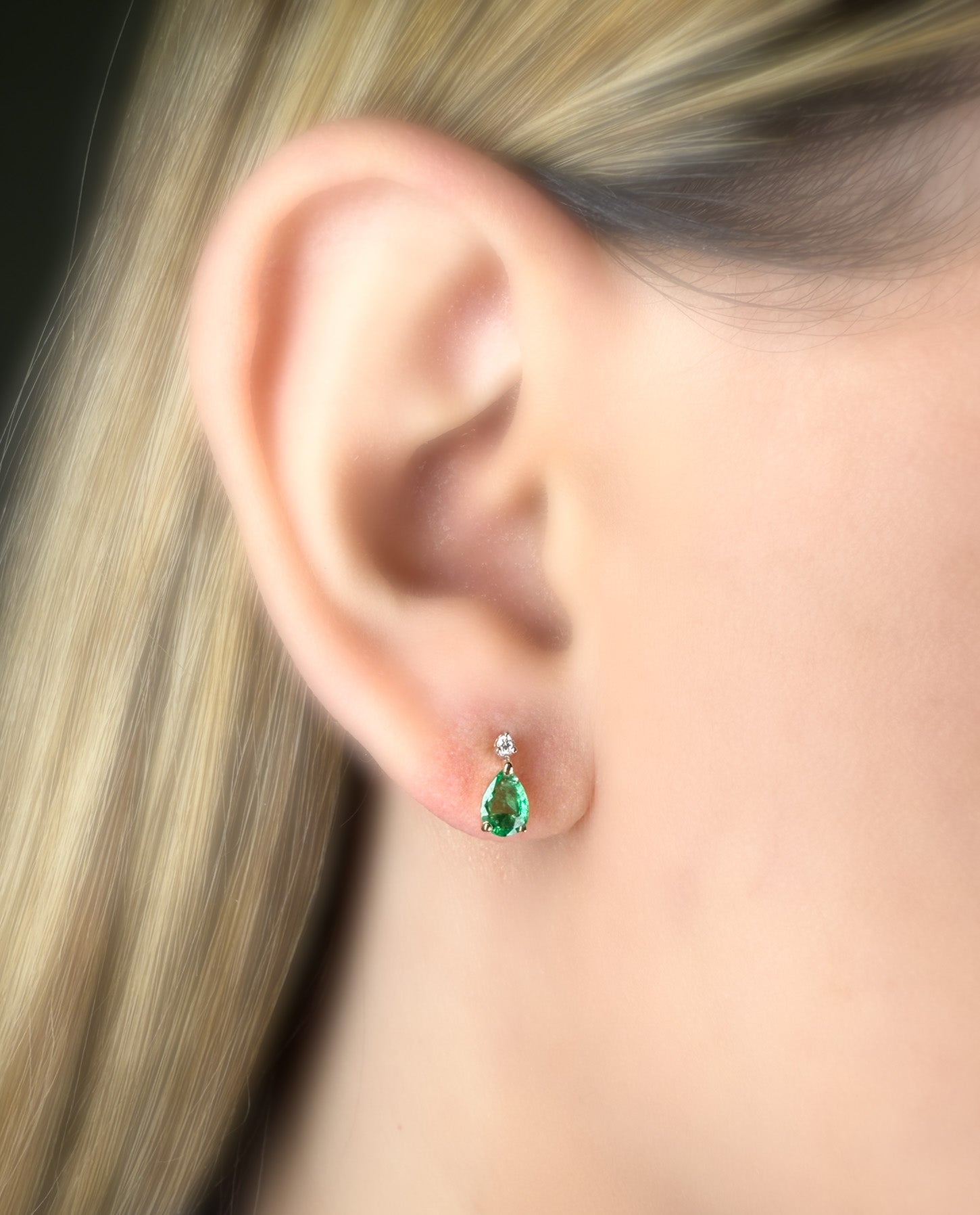 These classic stud earrings feature pear-shaped emeralds topped with round white diamonds, offering a refined mix of color and brilliance. Available in your choice of 14K white or yellow gold, the setting enhances the gem’s natural glow.
