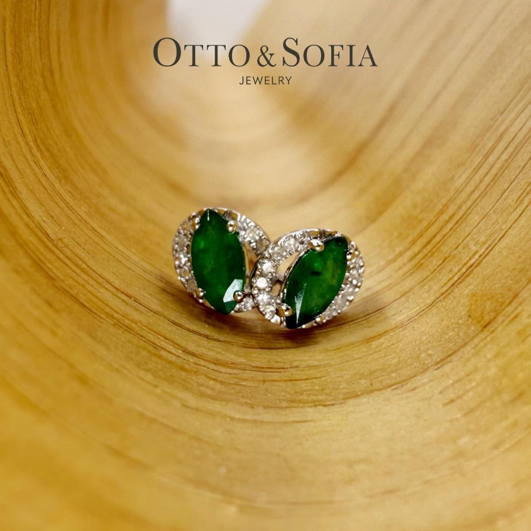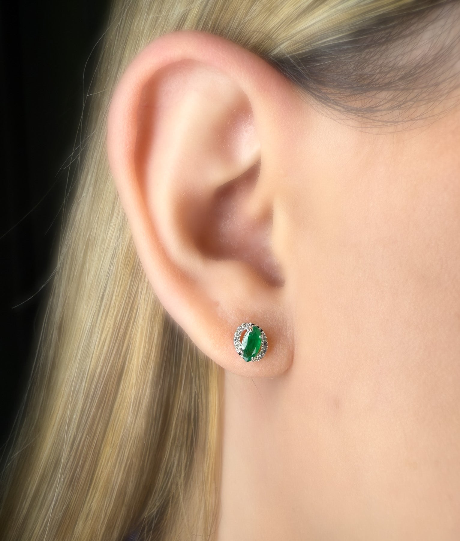 Each earring features a vivid marquise-cut emerald embraced by a sparkling half-halo of white diamonds. Set in 14K white gold, the design offers a graceful balance of bold color and classic brilliance.