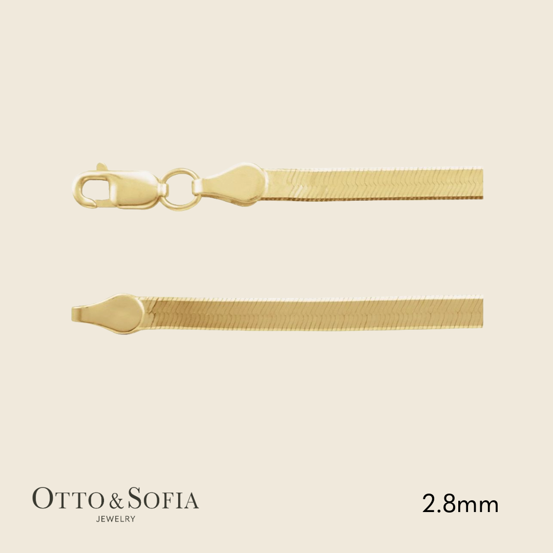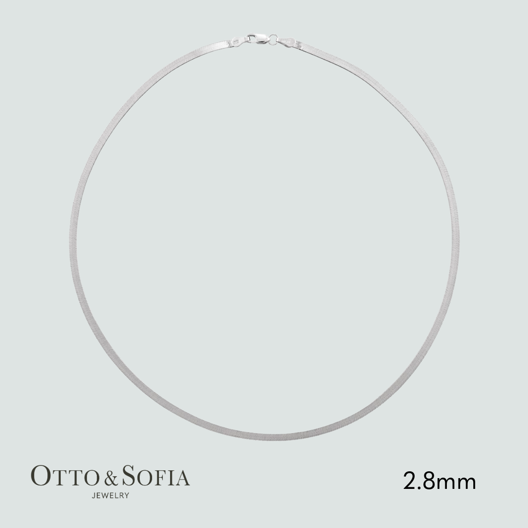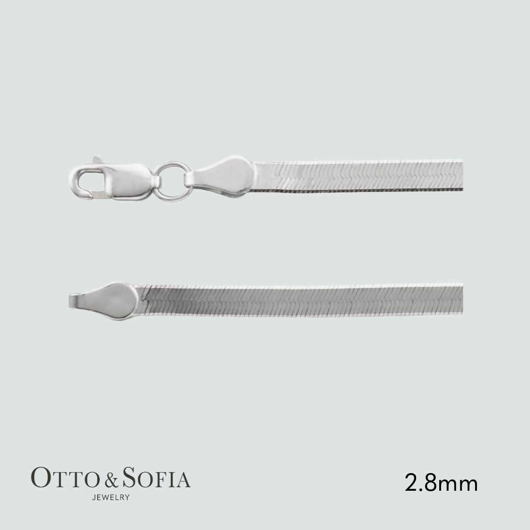 Sleek and timeless, this 14K white or yellow gold herringbone necklace is crafted with a smooth 2.8mm width that drapes beautifully along the neckline. Available in 16" or 18", it lies flat with a flexible finish for everyday comfort. Wear it solo for understated elegance or layered with other favorites for a modern, sophisticated look.