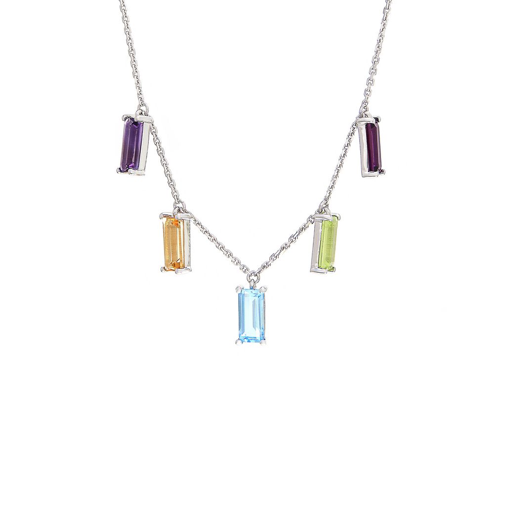 A vibrant lineup of amethyst, citrine, blue topaz, peridot, and garnet adds playful sophistication to this eye-catching necklace. Each gemstone is set vertically in sleek prongs, creating a colorful cascade along a polished 14K white gold chain.