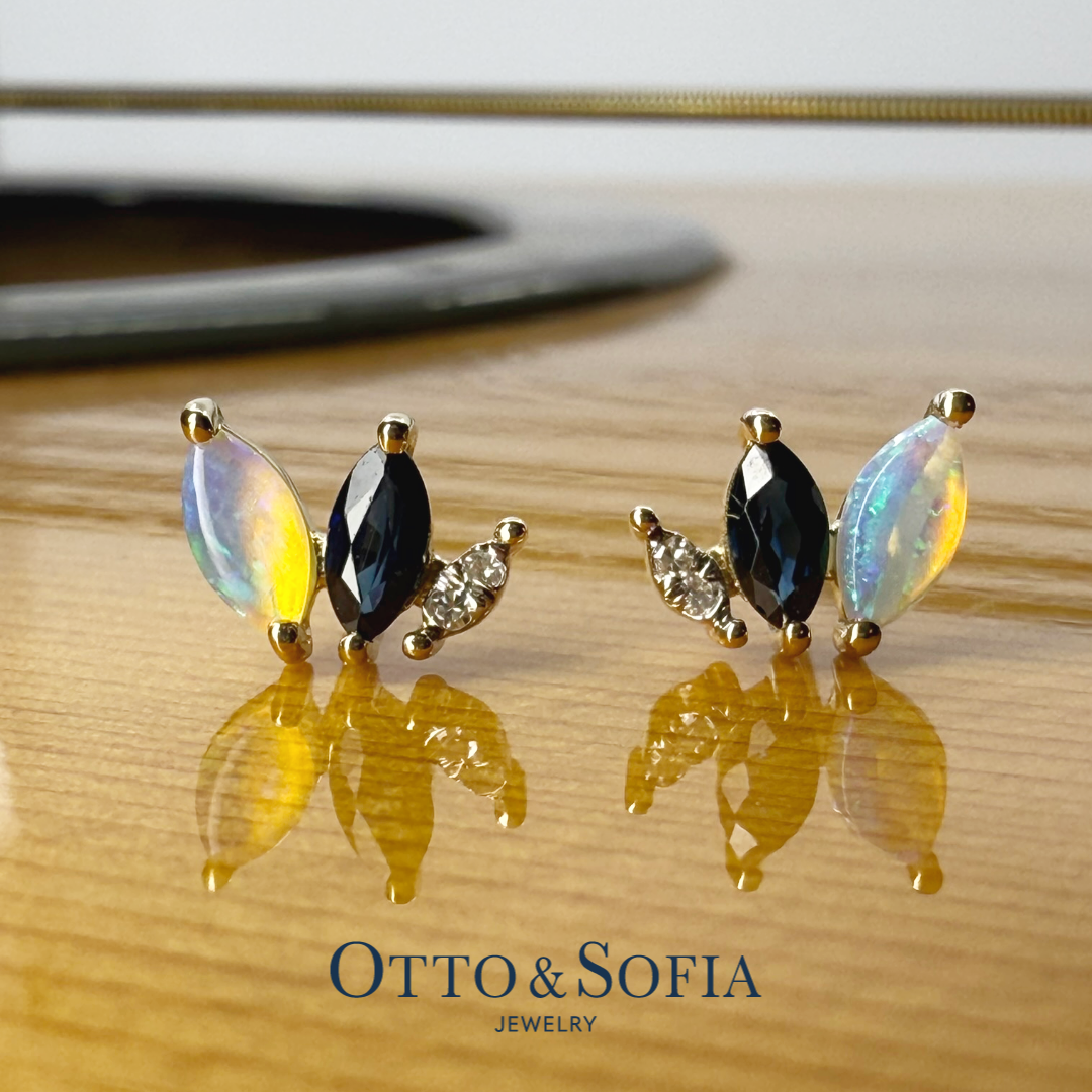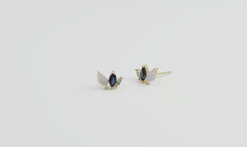 Soft opals, deep blue sapphires, and sparkling diamonds come together in a marquise-shaped trio of elegance. Set in 14K yellow gold, these stud earrings create a rich contrast of color, light, and texture.