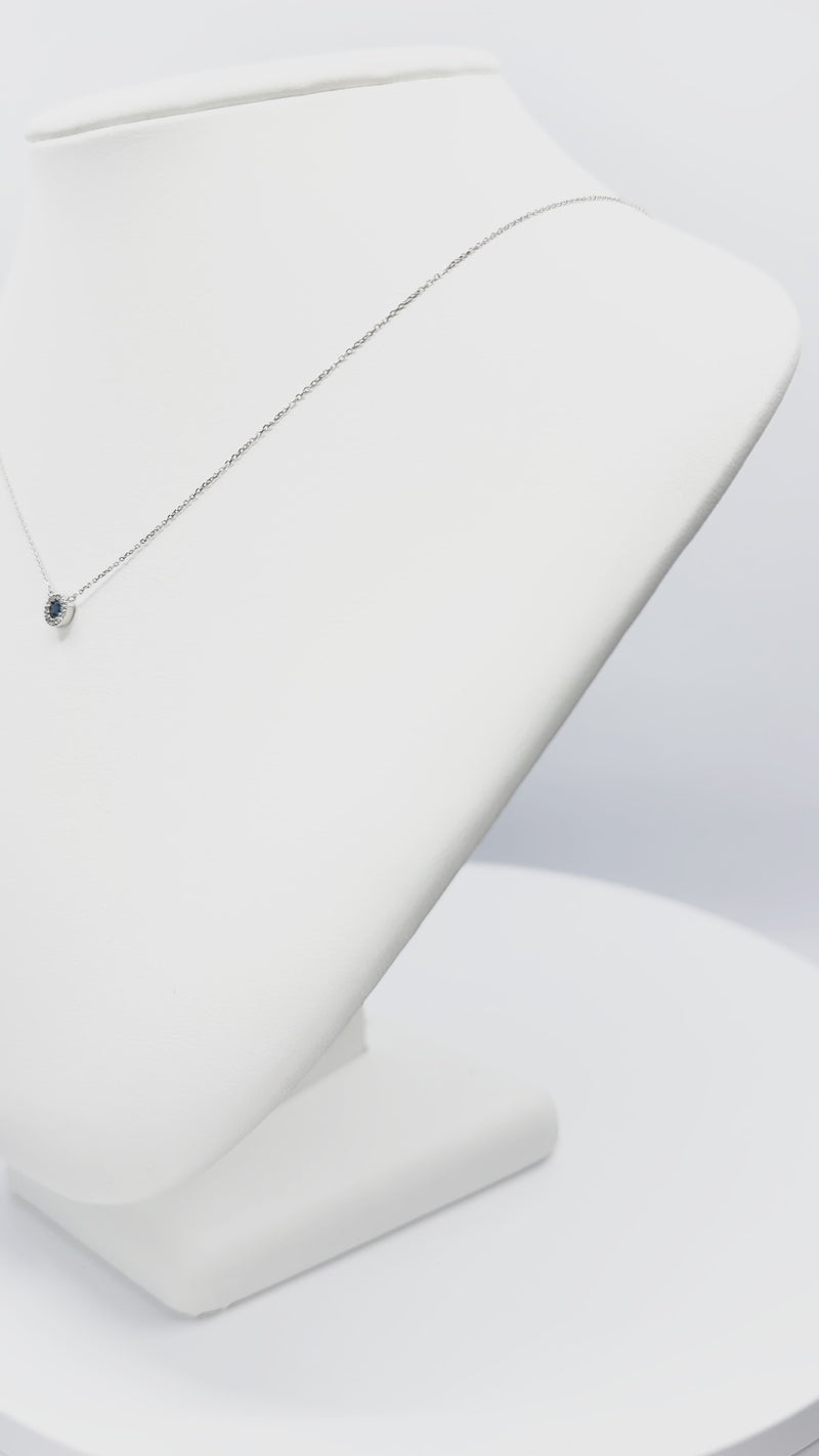 A deep blue sapphire anchors this elegant design, encircled by a radiant halo of white diamonds. Set in gleaming 14K white gold, the round silhouette offers timeless beauty with a modern edge.