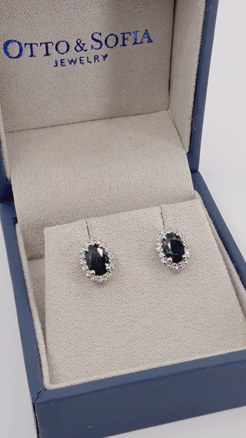 Vivid oval sapphires are framed by halos of brilliant white diamonds in these timeless 14K white gold studs. The contrast between deep blue and radiant sparkle creates a look of refined elegance.